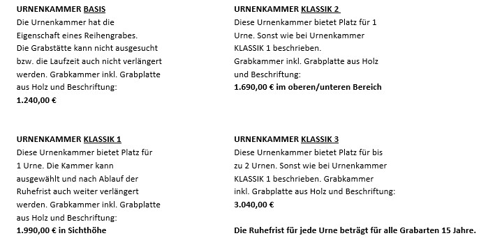 15 Jahre beträgt die Ruhezeit der einzelnen Urnen. Sie kann jederzeit verlängert werden. Bereits zu Lebzeiten kann der Interessierte sich eine Urnennische aussuchen.